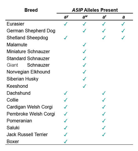 Willis seems to suggest another similar allele as for saddle tan. He would use this allele to describe the Dachsbracke or a Beagle, rather than black-and-tan. A study in our lab, presented at the conference on Advances in Canine and Feline Genomics and Inherited Disease in Baltimore, MD from Sept. 23-25, 2010, indicated that all saddle tan dogs have an at/at or at/a genotype. Saddle tan appears to be a modification of the black-and-tan phenotype caused by interaction of other genes with ASIP. We had reported a mutation in the RALY gene might be the cause.