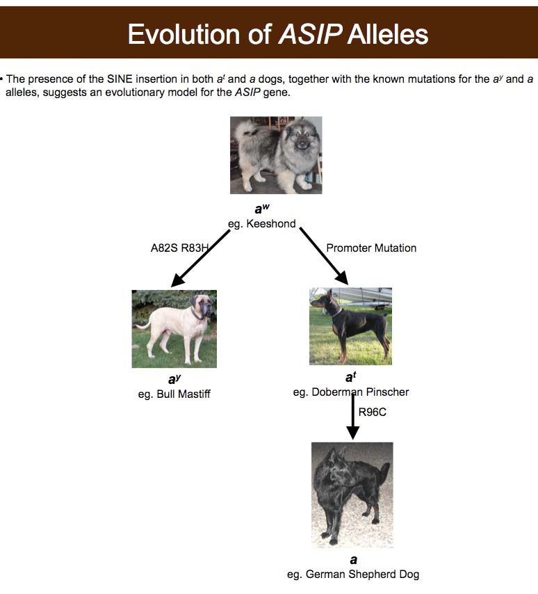 Originally shown on: Dreger, D. L. Kaelin, C. B., Barsh, G.S., Schmutz, S.M. Proposed evolution of the agouti locus alleles in domestic dogs. 5th International Canine and Feline Genome and Hereditary Disease Conference, Baltimore, MD Sep 22-25, 2010