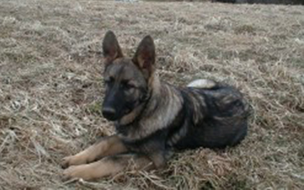 Agouti signal peptide is also the gene that causes a wolf or coyote to have yellowish hair with black tips and base, or what is often called banded. The competition, in that case, is going on as the hair is growing, which results in a hair that changes color along its length. In breeds with very long hair, there may be even more alternating bands of phaeomelanin and eumelanin. This gene is likely also causing the change in hair color in the Malamute, Siberian Husky (shown above), the Elkhound, and some German Shepherd Dogs. The allele which causes this banding of hairs is sometimes called the wild type allele (aw), or wolf sable. In German Shepherds, like Fello at the right, this pattern is called sable. Although this allele was once fixed in dogs, if we assume that they all descended from the wolf, it is not a very common allele in dog breeds today. Bannasch et al. (2021) have subdivided this phenotype into two which they call "Banded yellow (SY)" and "Agouti (AG)". The suggest the main difference among most of these dogs is that the lighter SY dogs have HCP1 and the darker AG dogs have HCP2 (based on Fig.2). |