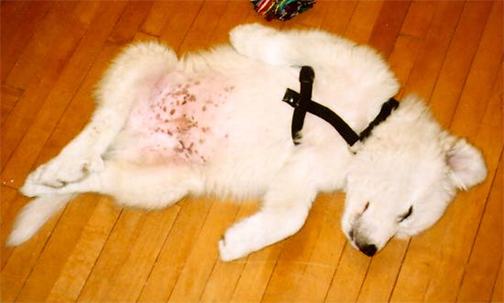 Samoyeds, such as Mitzi, are typically white. We have genotyped only 3 Samoyeds but interestingly all were "e/e" at MC1R and also "a/a" at the agouti locus. Sue Ann Bowling suggested we study such dogs. Are they white because the don't make black pigment in their hairs because of "e/e" and also can not make red pigment because they are "a/a"? There could be yet another gene involved, but this is a very intriguing hypothesis.