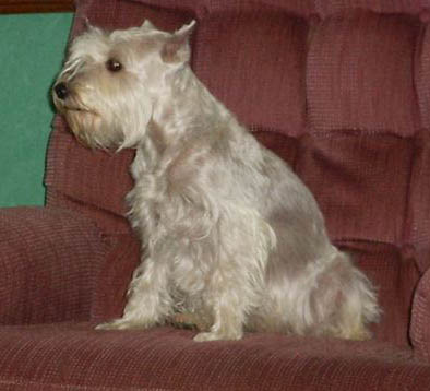 The Miniature Schnauzer is another breed in which the e/e dogs appear white or "silver", illustrated by Tasmin at the left. Note that the classic black-and-tan pattern caused by an "at/at" genotype at the agouti locus is called black-and-silver in this breed. It would seem that all phaeomelanin pigmentation is diluted to a white or silver in Miniature Schnauzers, suggesting they are fixed at i/i
